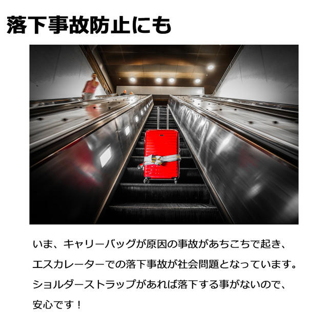 - ①社会問題となっているエスカレーターでのスーツケース落下事故の防止になります。