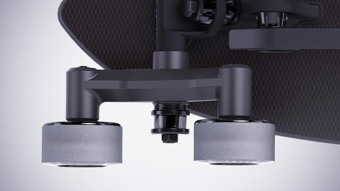 秘密は特殊なボトム構造です。特許技術で開発した「V-frame(V-フレーム)」と8個のウィールを上下少しずつずらして配置することで、その8個のウィールは上下に跳ね上がり、階段の形状に適合しながらスムーズに降りてゆきます。